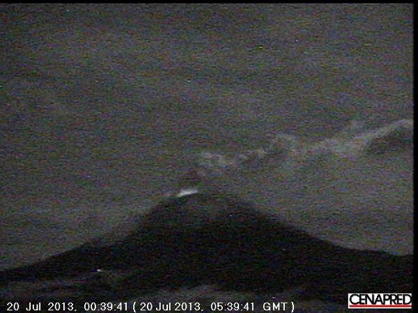 El Popocatépetl activo a la hora 0:40am/Jul.20 con incandescencia y larga pluma de gases